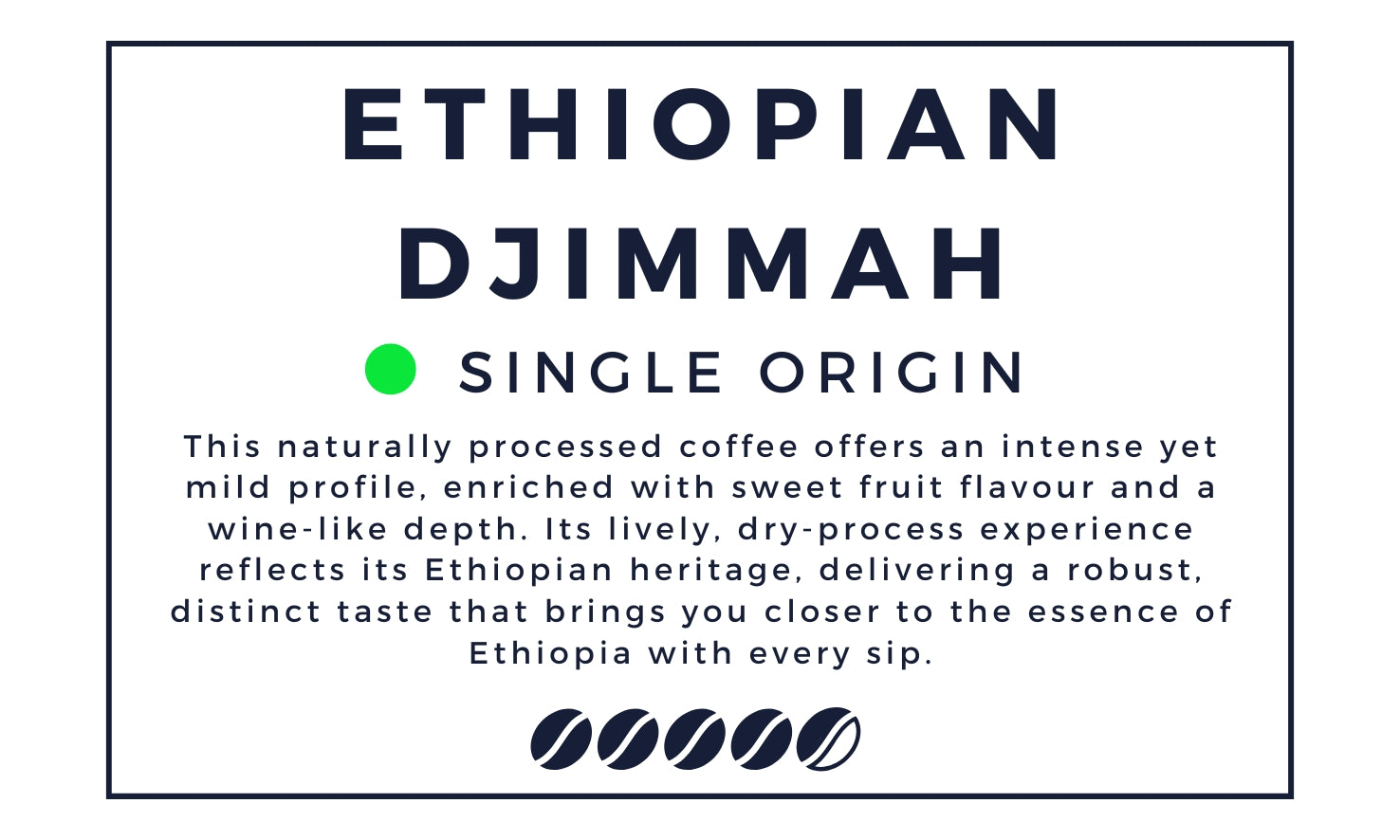 This naturally processed coffee offers an intense yet mild profile, enriched with sweet fruit flavour and a wine-like depth. Its lively, dry-process experience reflects its Ethiopian heritage, delivering a robust, distinct taste that brings you closer to the essence of Ethiopia with every sip.